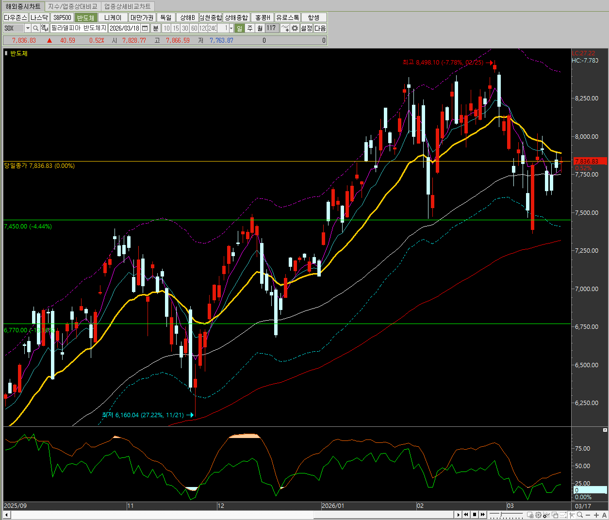 필라델피아 반도체 지수는 7,836.83을 기록하며 +0.52% 상승하여 기술주 중심의 매수세를 증명했습니다.