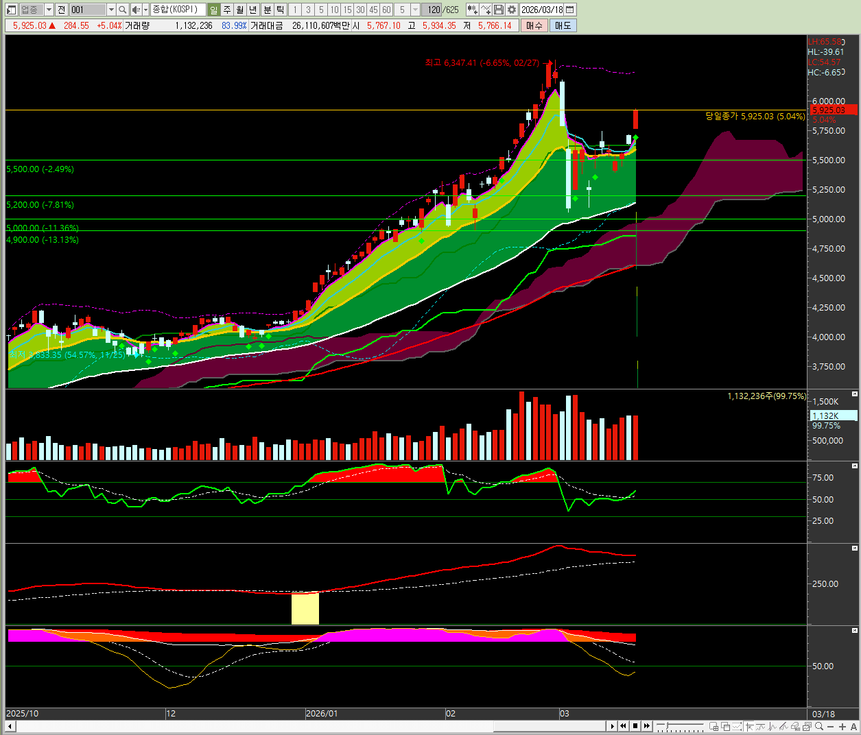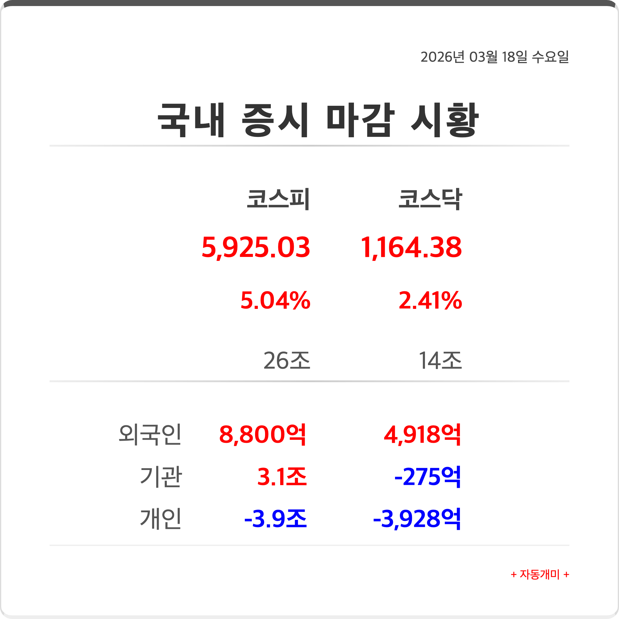 2026년 03월 18일 수요일 - 정부 자본시장 활성화 기대감에 코스피 5%대 폭등 마감
