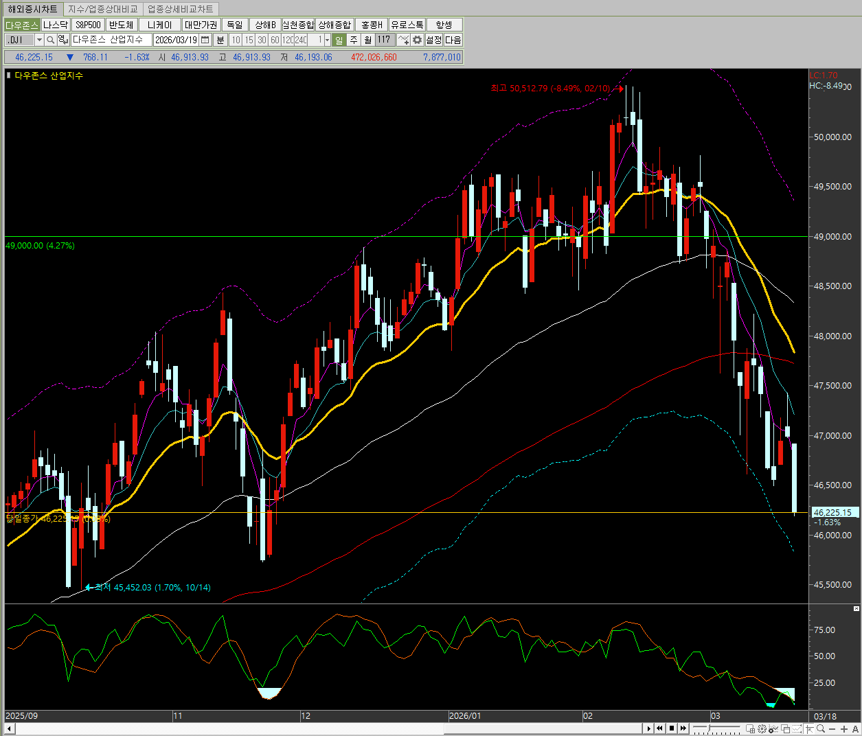 지수명 종가 변동 변동률 다우존스 46,225.15 -768.11 -1.63% 나스닥 종합 22,152.42 -327.11 -1.46% S&P 500 6,624.70 -91.39 -1.36% 필라델피아 반도체 7,795.13 -41.70 -0.53%
