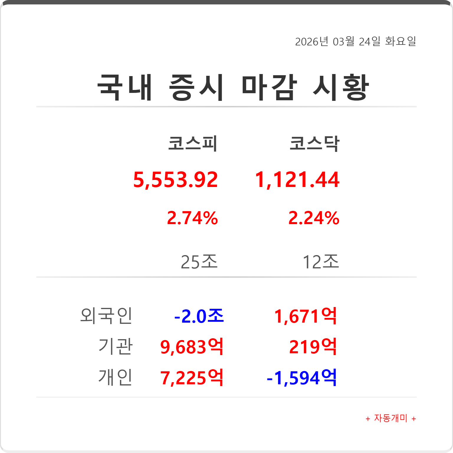 지수명 종가 변동률 거래대금 코스피 5,553.92 2.74% 25조 코스닥 1,121.44 2.24% 12조