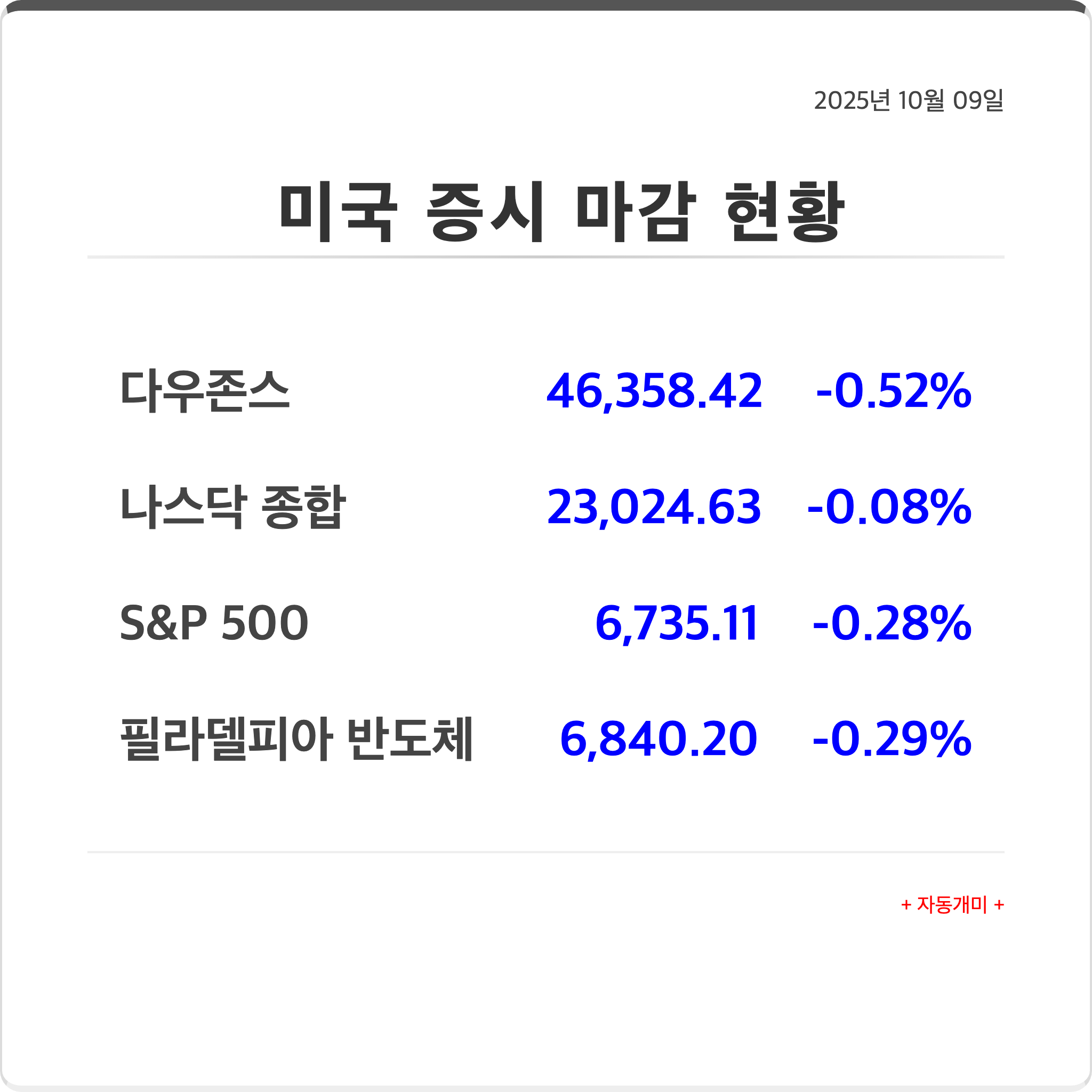 2025년 10월 9일, 미국 증시는 주요 지수가 일제히 하락하며 조정을 받았습니다.