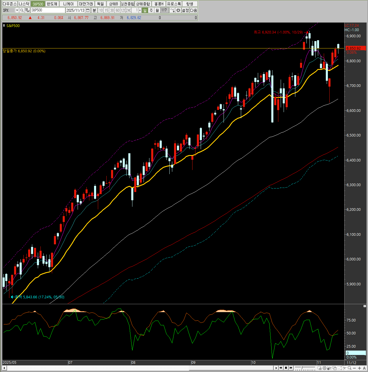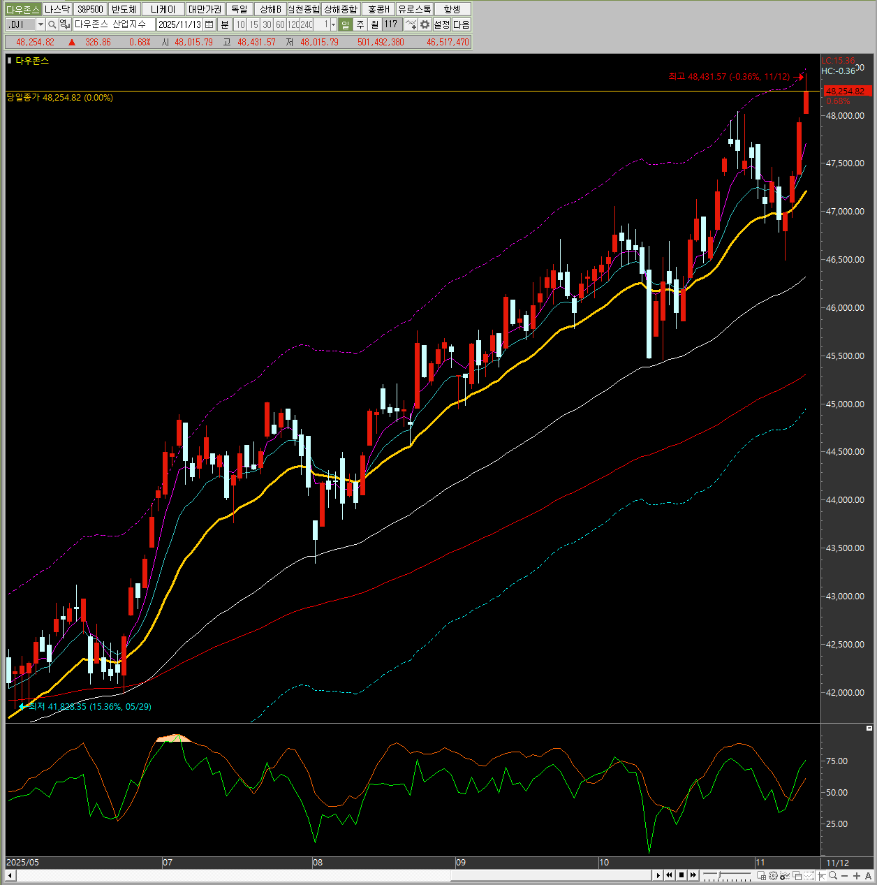 지수 종가 변동폭 변동률 다우존스 48,254.82 326.86 +0.68% 나스닥 종합 23,406.46 -61.84 -0.26% S&P 500 6,850.92 4.31 +0.06% 필라델피아 반도체 7,082.13 102.43 +1.47%