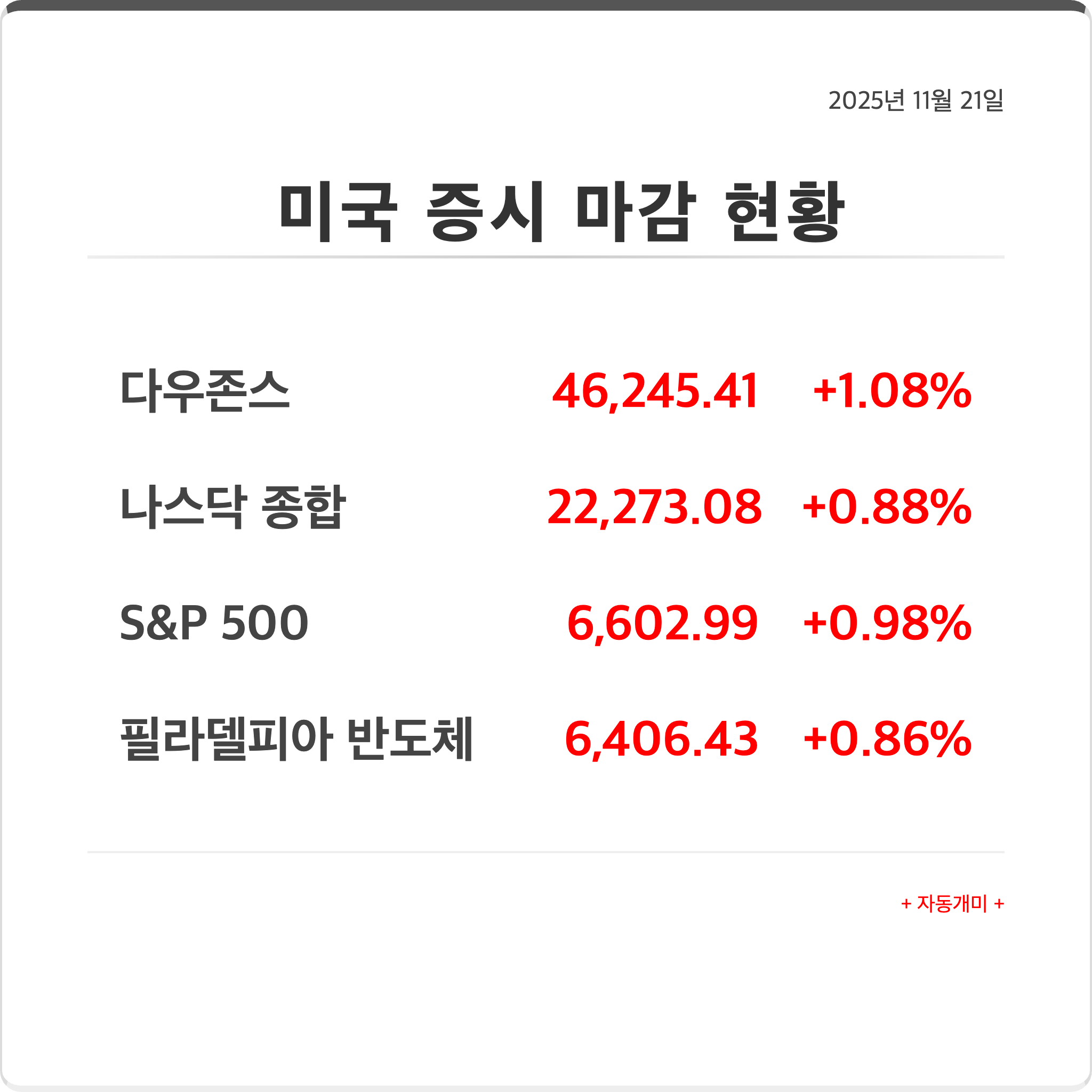 **다우존스 지수**가 **+1.08%**로 가장 큰 상승률을 기록했으며, **나스닥 종합(+0.88%)**과 **S&P 500(+0.98%)**도 1% 내외의 강세를 보였습니다.