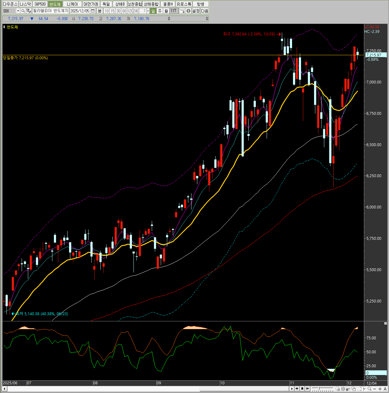 **메타, 엔비디아** 등 AI 대형주가 강세를 보였음에도 불구하고, **마이크론** 등 일부 반도체 종목과 **애플, 아마존** 등 빅테크의 약세로 인해 **필라델피아 반도체 지수**는 하락했습니다.