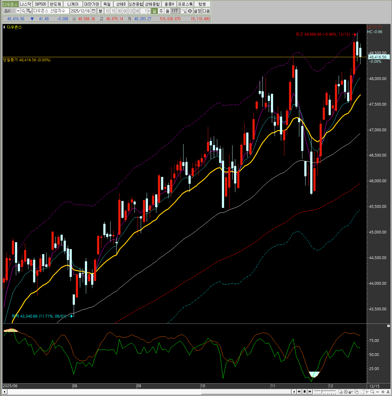 지수 종가 변동치 변동률 다우존스 48,416.56 -41.49 -0.09% 나스닥 종합 23,057.41 -137.76 -0.59% S&P 500 6,816.51 -10.90 -0.16% 필라델피아 반도체 6,990.41 -43.16 -0.61%