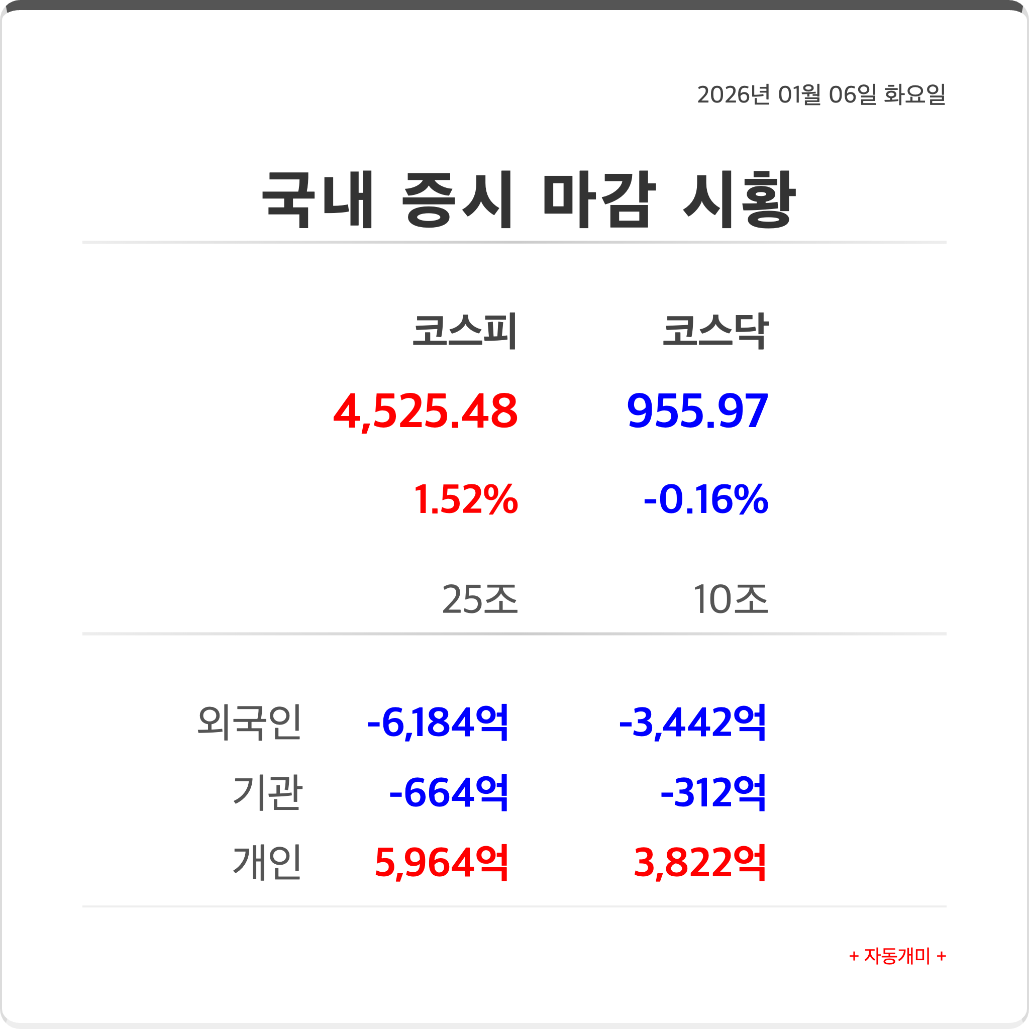 지수 종가 변동률 거래대금 코스피 4,525.48 1.52% 25조 코스닥 955.97 -0.16% 10조 요약: 코스피는 4,525.48 (+1.52%)로 사상 최고가를 기록하며 마감했고, 코스닥은 955.97 (-0.16%)로 소폭 하락하며 장을 마쳤습니다.