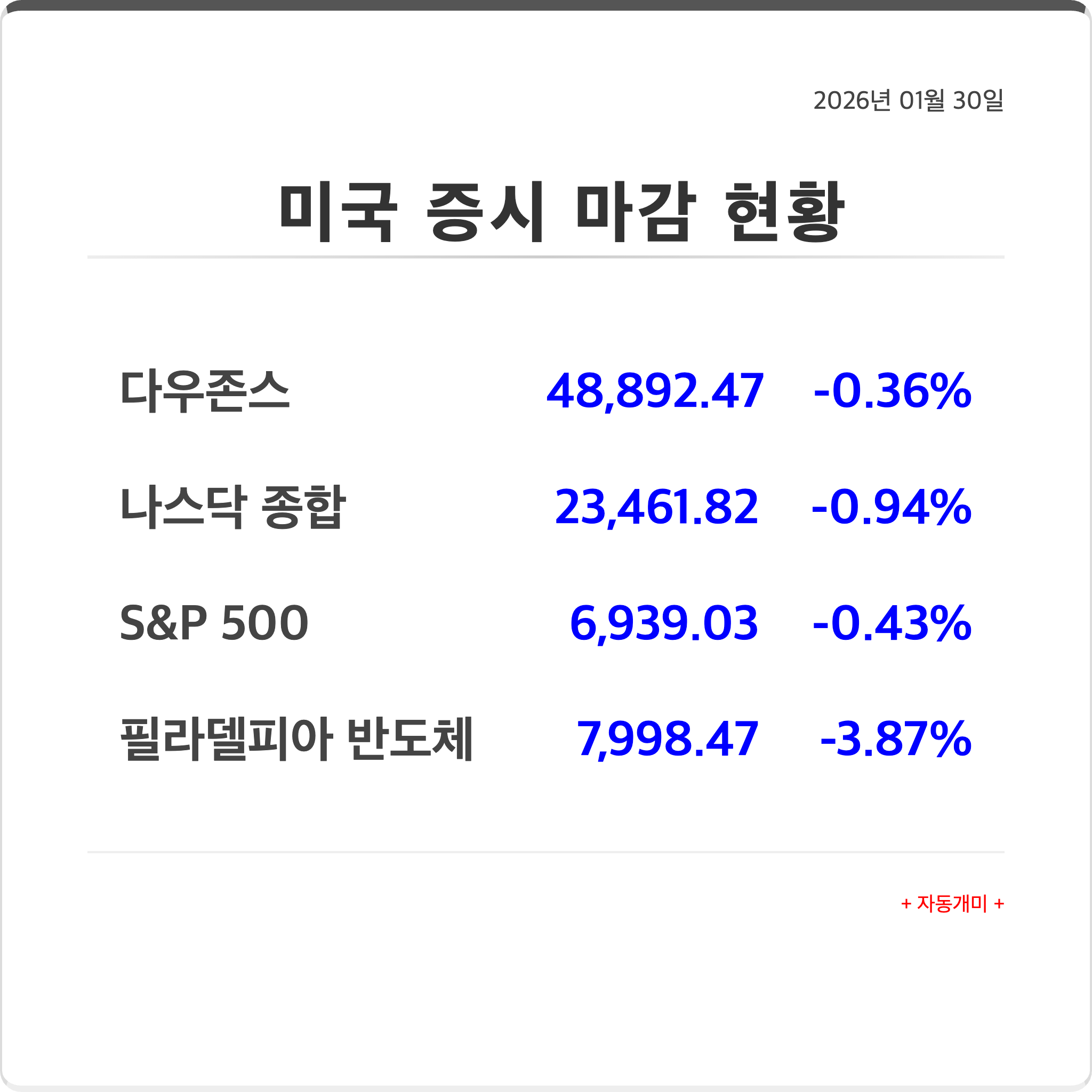 2026년 1월 30일 미국 증시는 전반적인 하락세로 마감했습니다.