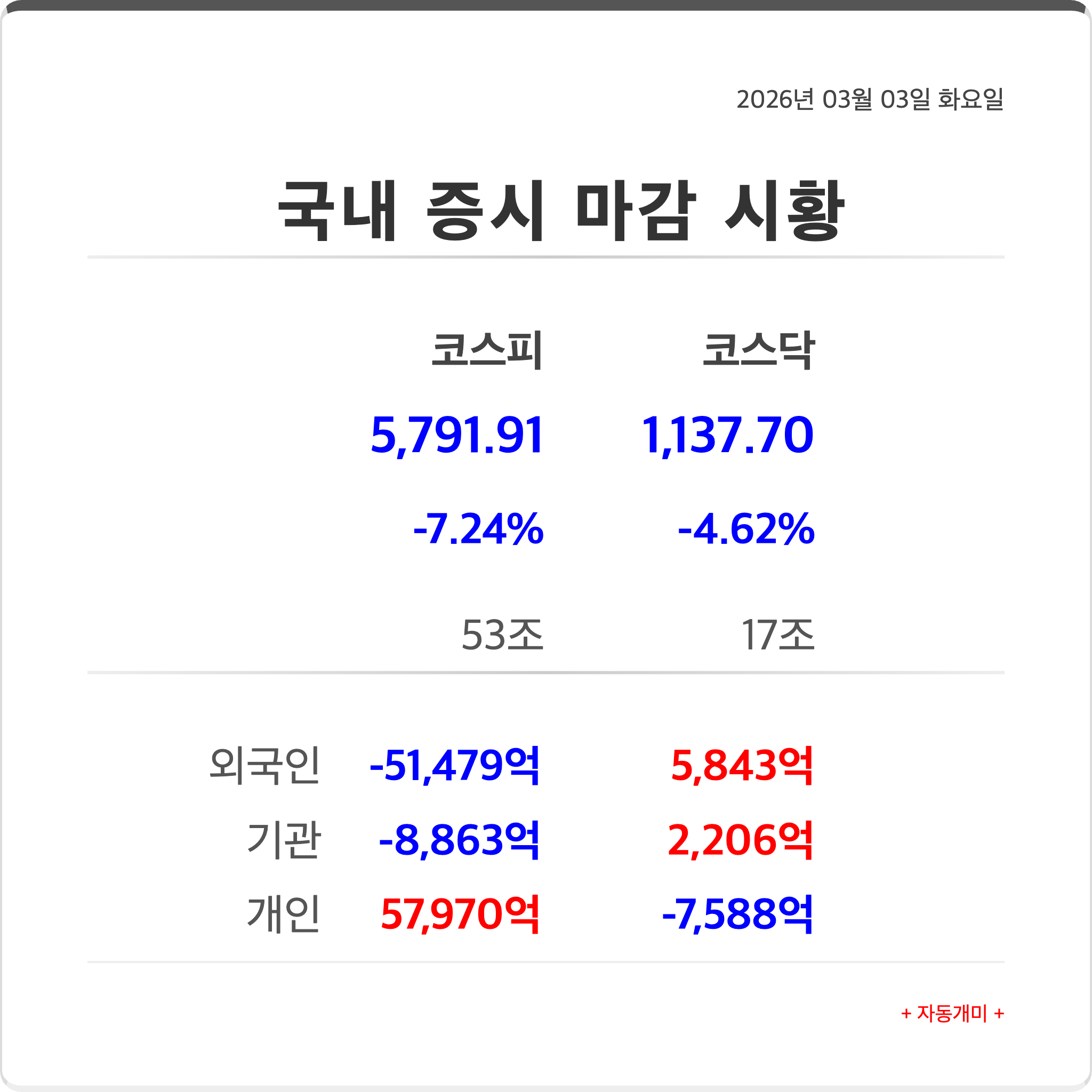 2026년 03월 03일 화요일 - 美-이란 전쟁 리스크 고조로 코스피 7%대 폭락 마감