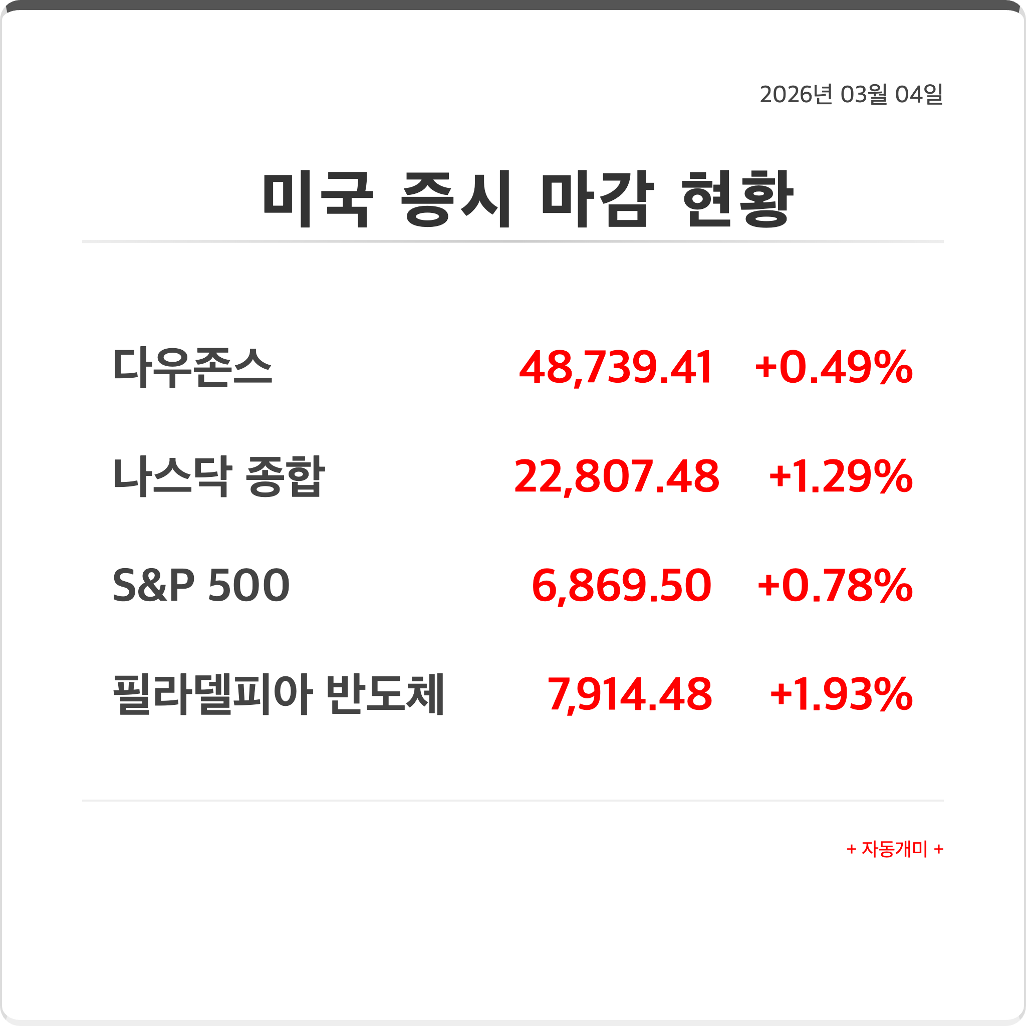 지수명 종가 대비 변동률 다우존스 48,739.41 238.14 +0.49% 나스닥 종합 22,807.48 290.79 +1.29% S&P 500 6,869.50 52.87 +0.78% 필라델피아 반도체 7,914.48 149.60 +1.93%