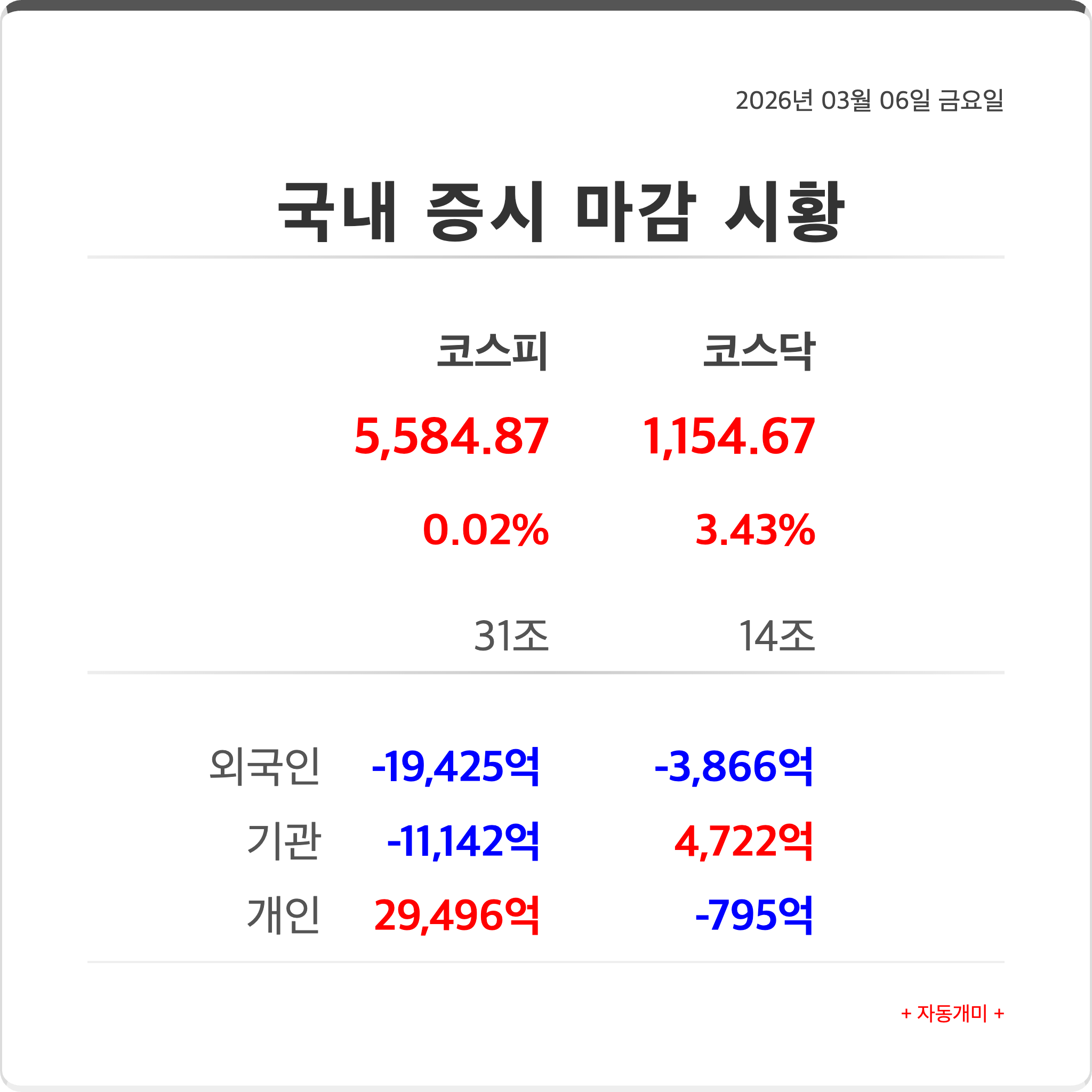 지수명 종가 변동률 거래대금 코스피 5,584.87 0.02% 31조 코스닥 1,154.67 3.43% 14조
