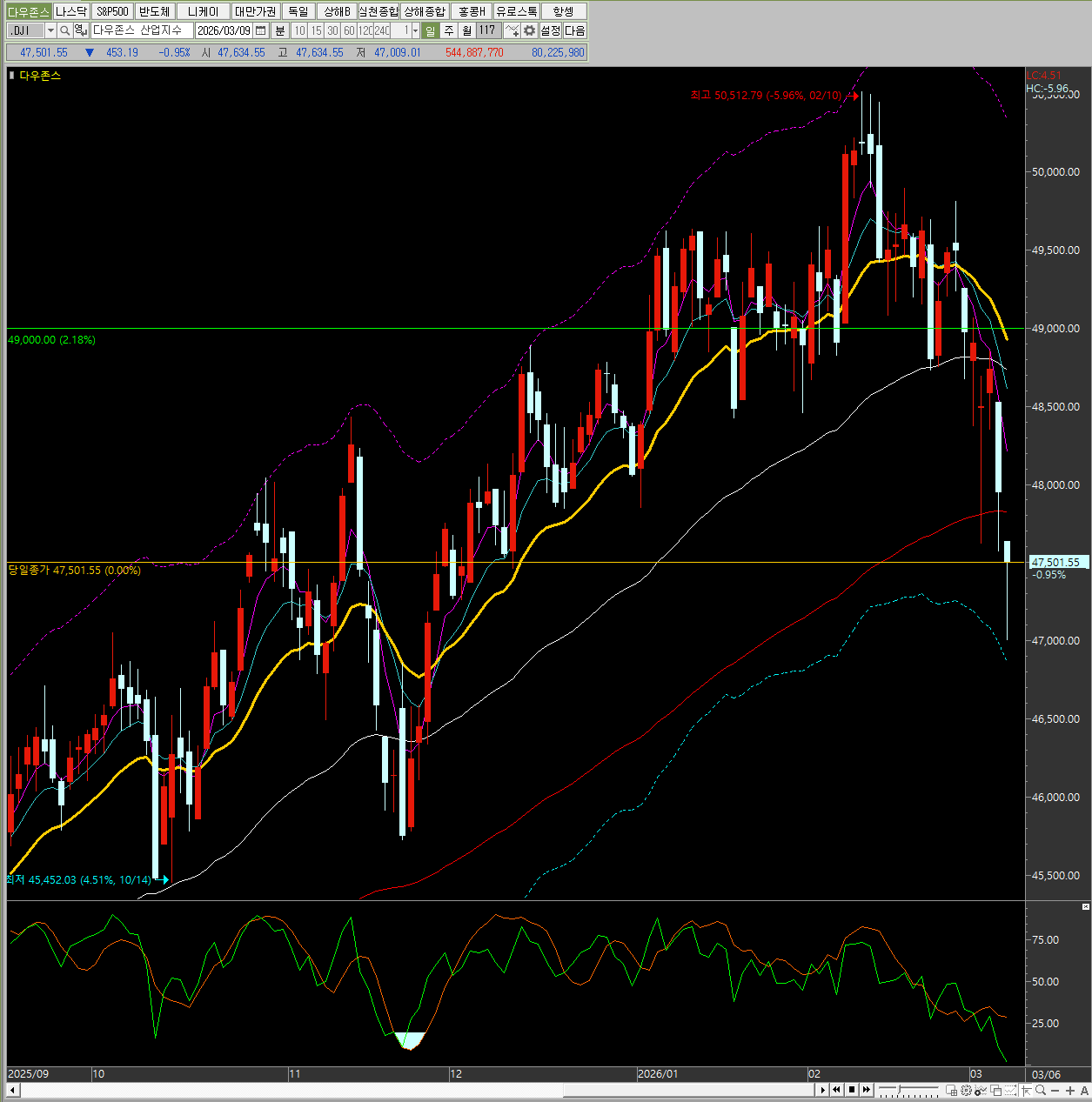 지수명 종가 대비 등락률 다우존스 47,501.55 -453.19 -0.95% 나스닥 종합 22,387.68 -361.31 -1.59% S&P 500 6,740.02 -90.69 -1.33% 필라델피아 반도체 7,514.74 -307.03 -3.93%