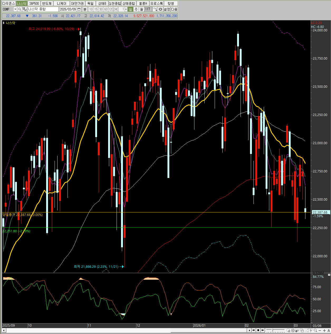 나스닥 종합 지수 역시 -1.59% 하락하며 기술적 부담감을 드러냈습니다.