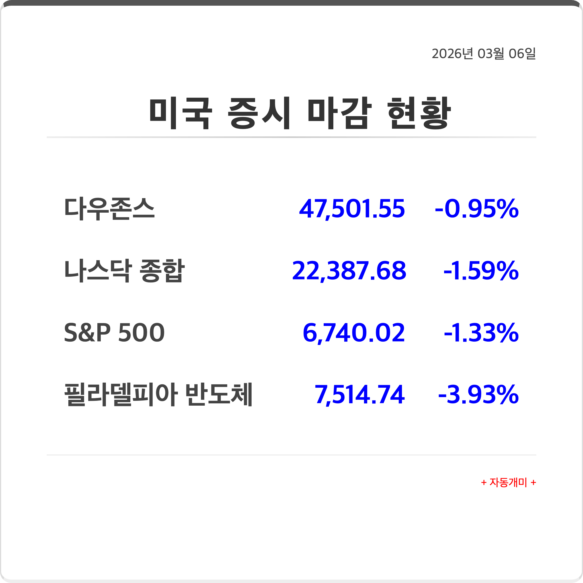 2026년 03월 06일 금요일 - 미 증시, 반도체 및 빅테크 주도로 일제히 하락 마감미국증시 2026. 3. 9. 08:26