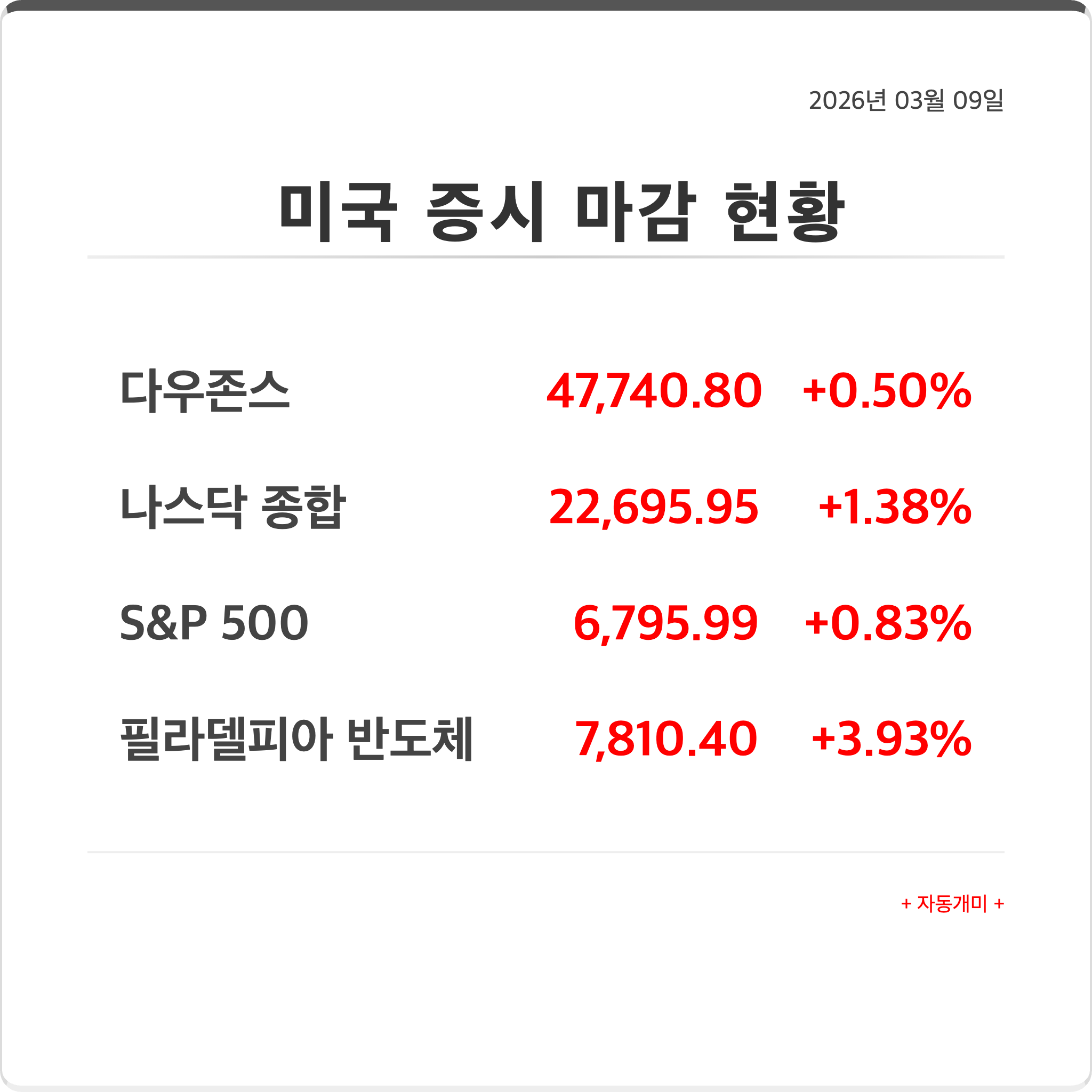 2026년 3월 9일 미국 증시는 필라델피아 반도체 지수의 강력한 반등에 힘입어 3대 지수가 모두 기분 좋은 상승세를 기록했습니다.