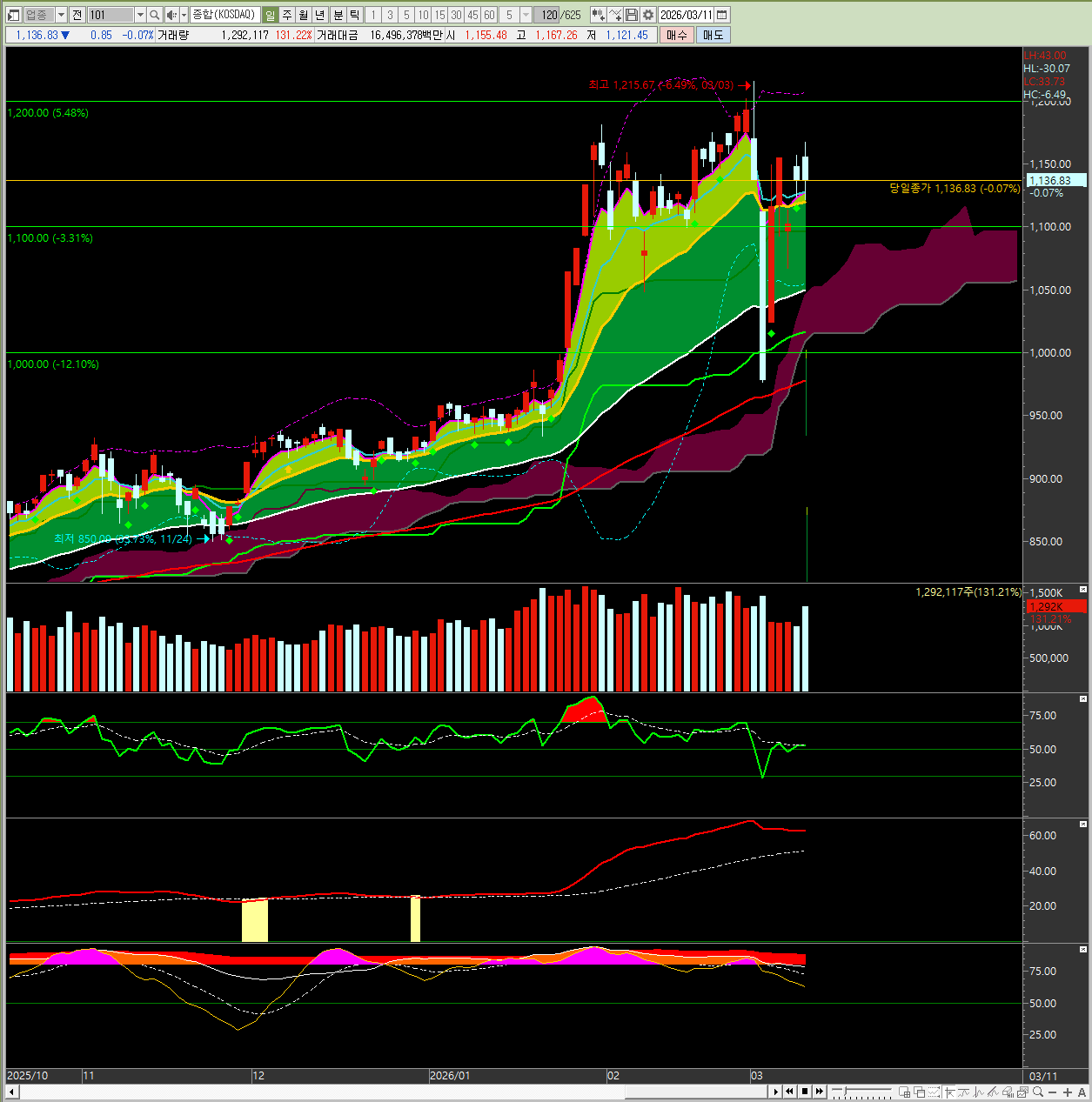 반면 코스닥은 외국인과 기관의 동반 매도세에 -0.07% 소폭 하락하며 1,136.83포인트로 혼조세를 보였습니다.